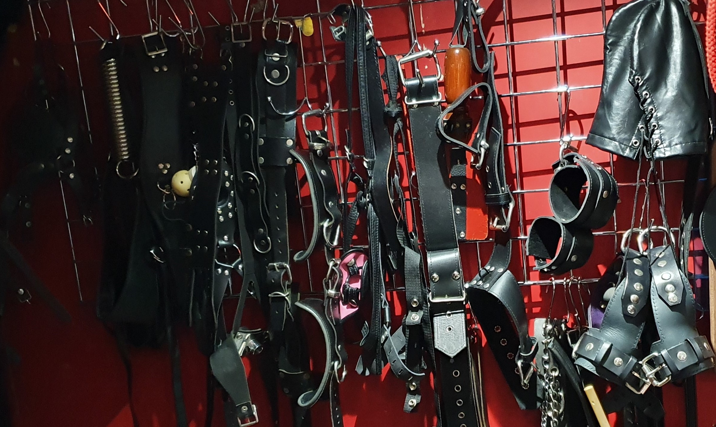 Consensually restraining you, physically, Sensory, Suspension or Postural with leather cuffs, ropes, chains, blindfold, hoods or other restrains.